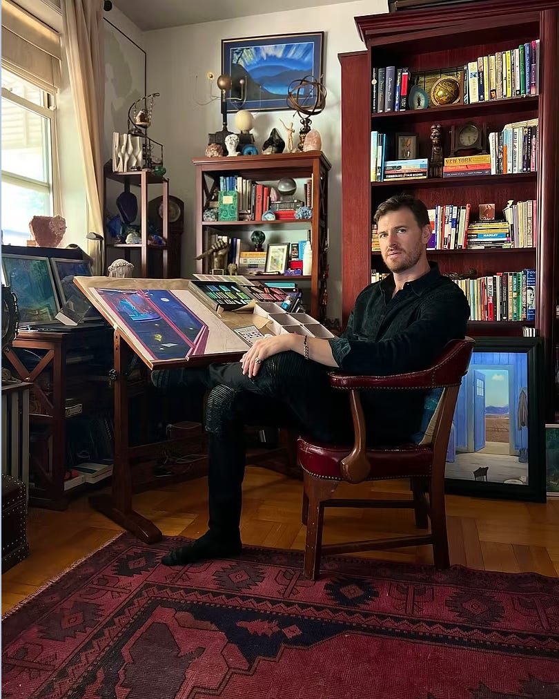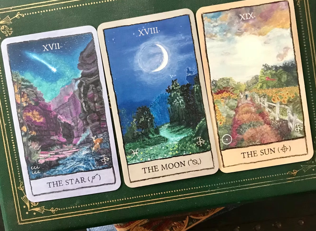 John shares how this extraordinary project began during the pandemic, when visions of celestial skies and archetypal terrains appeared to him almost fully formed. Over five years, he translated these inner landscapes into hand-drawn paintings, borders, lettering, and even unique sigils—imbuing each card with the soulful touch of lived time and experience.